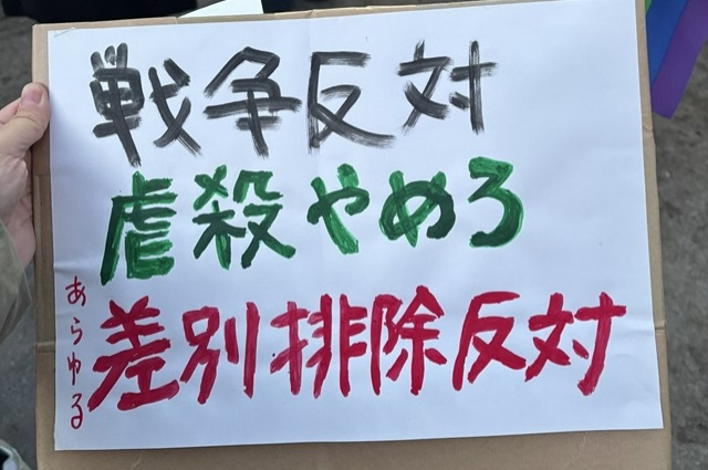 一方で、冷笑するような若い男性たちや、ただ何やってるかよくわからずに見ていたり、物珍しくて撮影していたりする人たちの姿もあった。そういう人たちには、両面作ったプラカードのこっち側が響くかな、と何となく思ってわざと見せるようにしてみたりした。